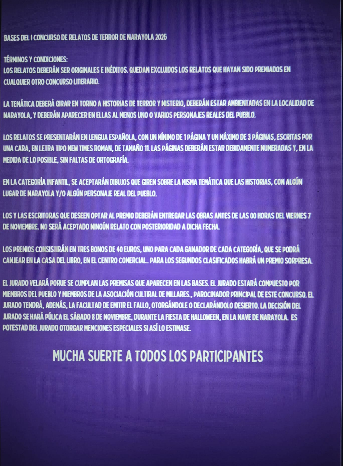 Los relatos deberán ser originales e inéditos, escritos en español y con una extensión de entre una y tres páginas. La temática debe girar en torno a historias de terror y misterio ambientadas en Narayola, incluyendo al menos un personaje o lugar real del pueblo.