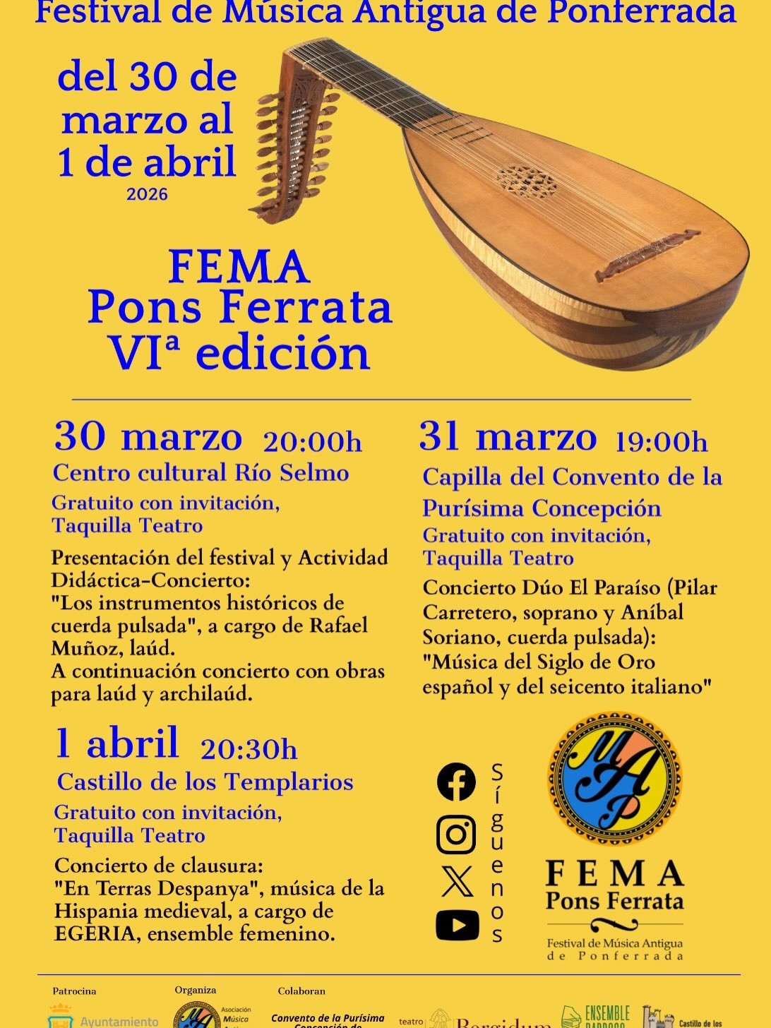 El Ayuntamiento de Ponferrada y la Asociación Música Antigua Ponferrada han presentado la sexta edición del FEMA Pons Ferrata, que se celebrará del 30 de marzo al 1 de abril. Este festival busca consolidar un ciclo de música estable que ponga en valor los edificios históricos del municipio, fusionando arte y patrimonio en entornos emblemáticos.