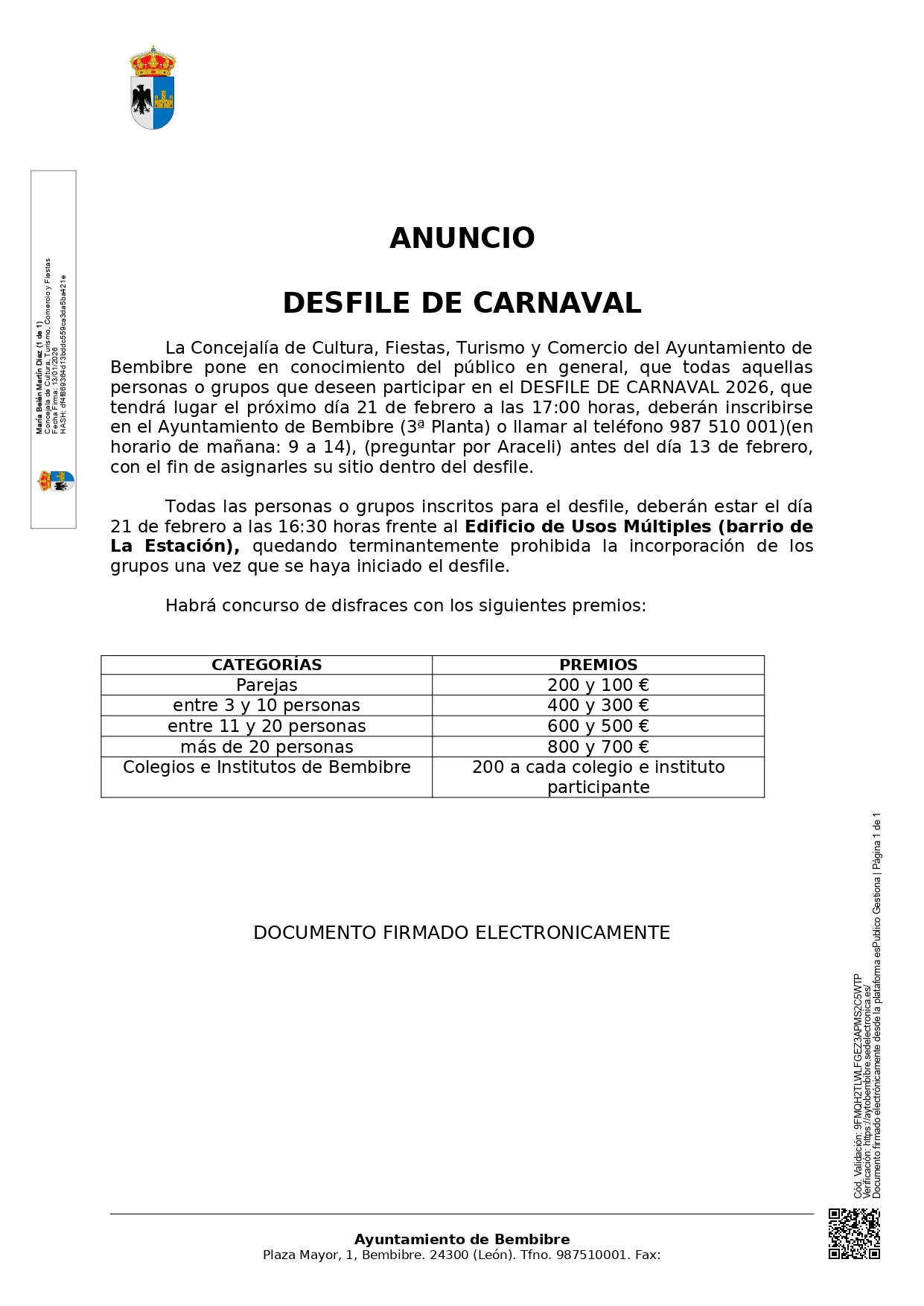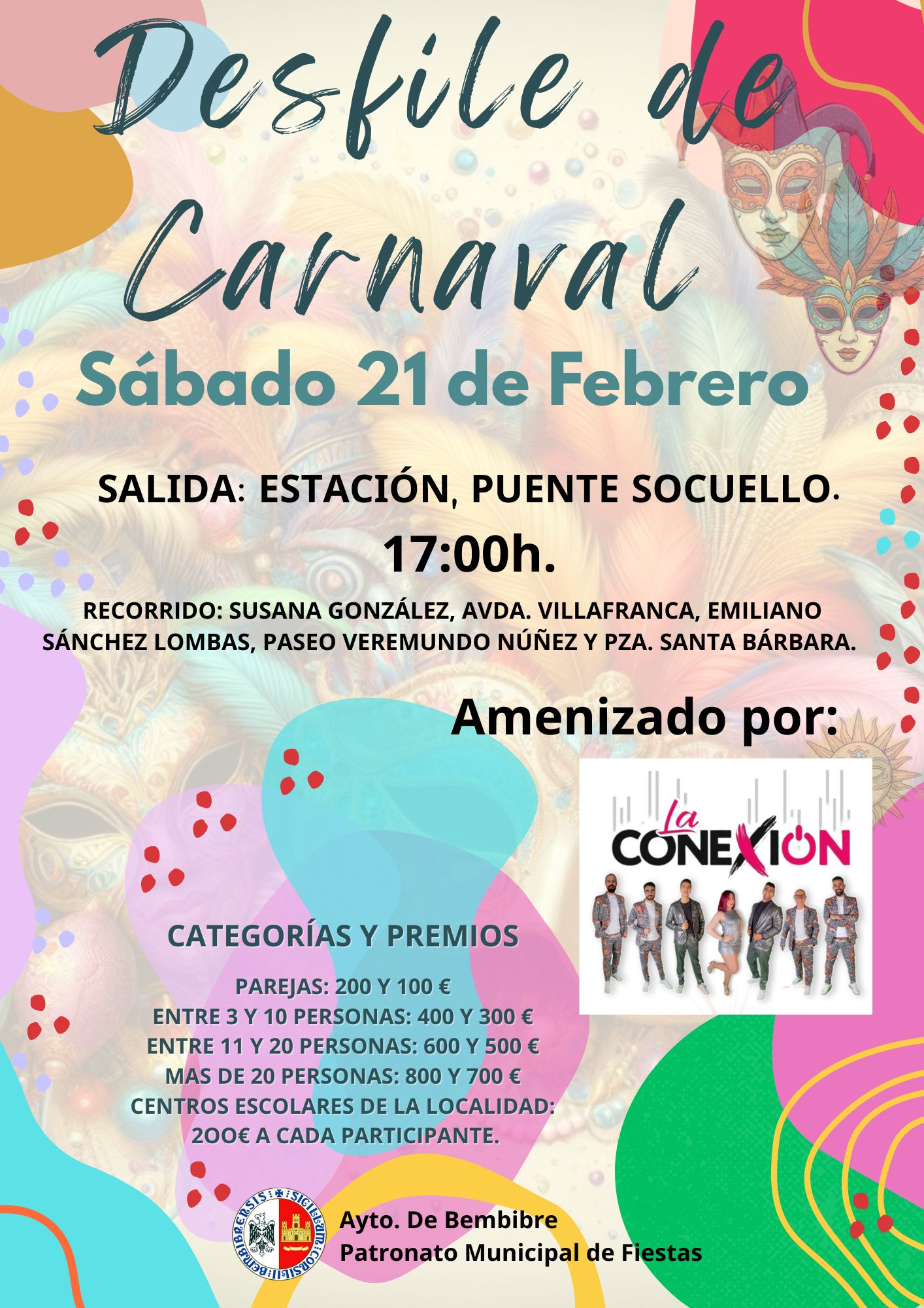 La magia, el color y la creatividad volverán a tomar las calles de Bembibre el próximo sábado 21 de febrero con la celebración del Desfile de Carnaval 2026, organizado por la Concejalía de Cultura, Fiestas, Turismo y Comercio del Ayuntamiento. El evento, uno de los más esperados del invierno berciano, contará con un concurso de disfraces que repartirá premios en metálico por valor de varios miles de euros entre las diferentes categorías participantes.