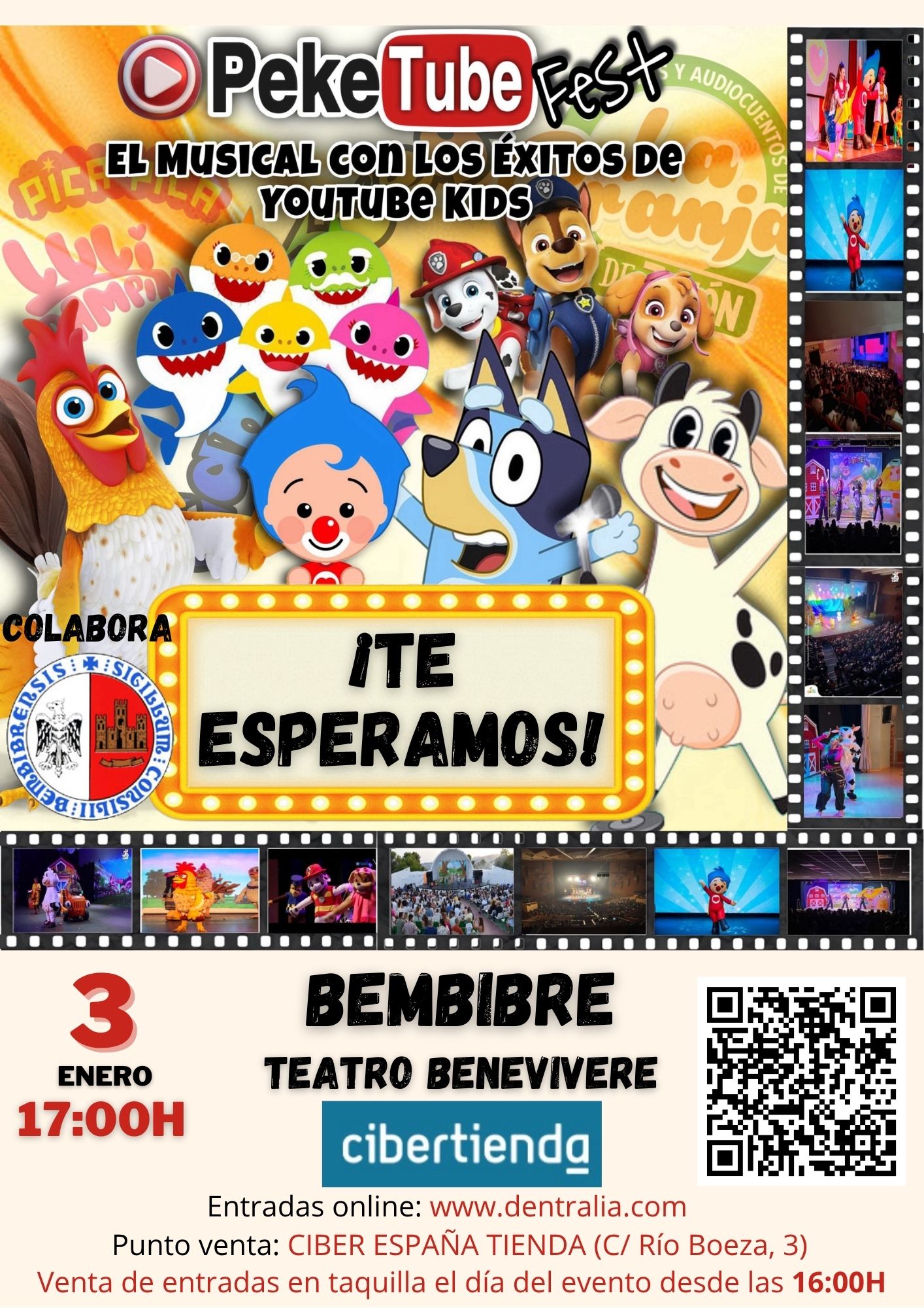El Teatro Benevívere de Bembibre vibrará con música, color y diversión el próximo sábado 3 de enero, con la llegada del espectáculo infantil PEKE TUBE, que presenta “El musical con los éxitos de YouTube Kids”. La función comenzará a las 17:00 horas y está dirigida a los más pequeños y sus familias.