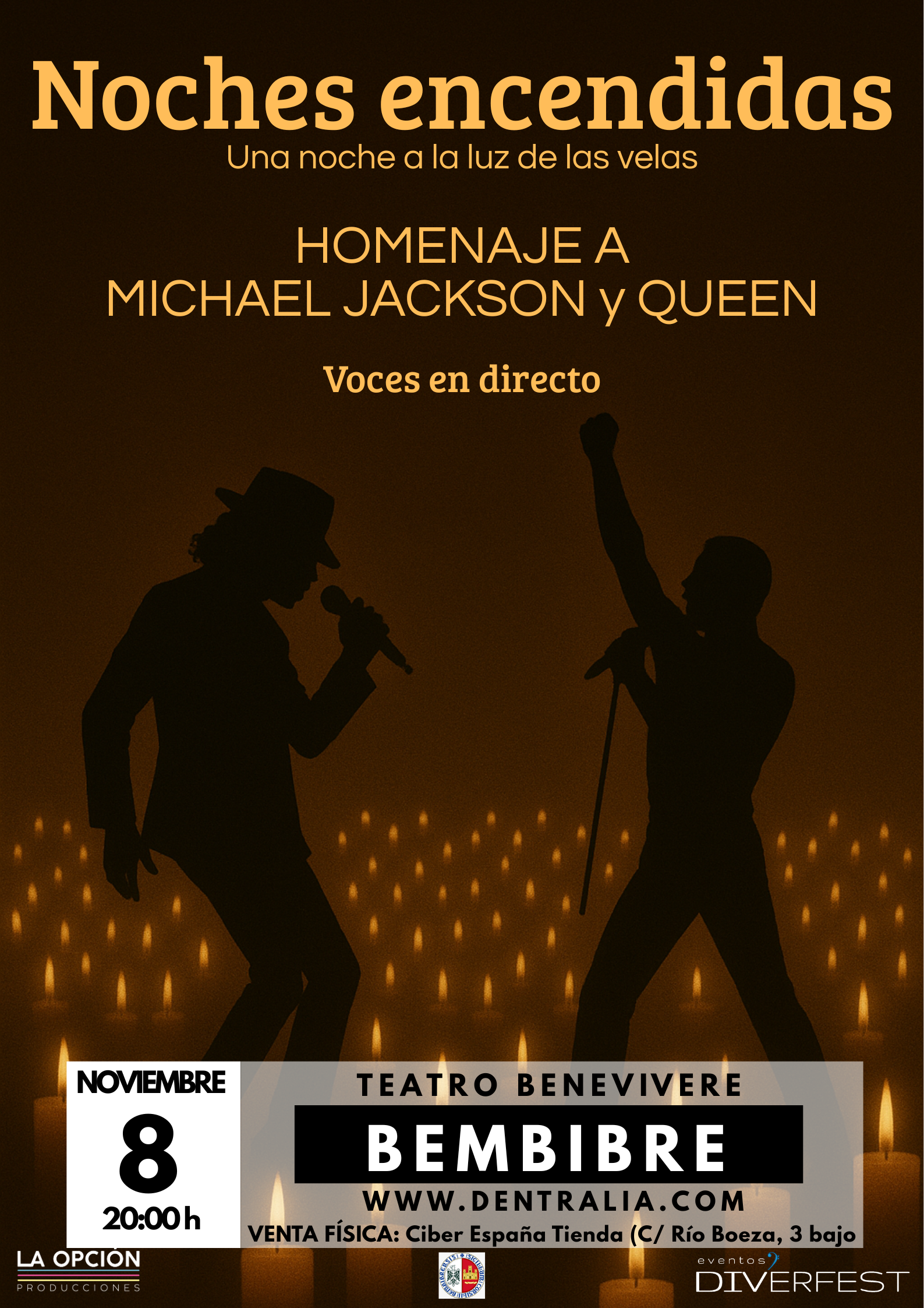 El Teatro Benevivere de Bembibre se vestirá de gala el próximo 8 de noviembre de 2025, a las 20:00 horas, para acoger un espectáculo único y sensorial: “¡Noches encendidas!”. Este concierto ofrecerá un viaje musical inolvidable que rinde homenaje a dos leyendas indiscutibles de la música: Queen y Michael Jackson, en un formato excepcionalmente íntimo y elegante, iluminado únicamente por la suave y mágica luz de cientos de velas.