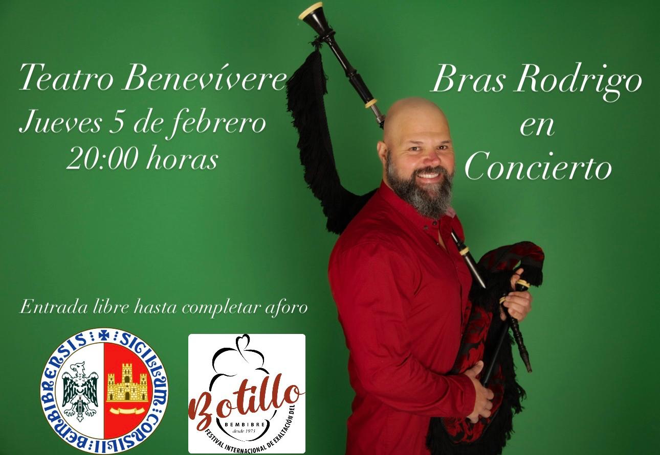 El Teatro Benevivere de Bembibre se prepara para vivir una noche mágica y con sello celta este jueves 5 de febrero. El escenario acogerá a las 20:00 horas la actuación del gaitero internacional Bras Rodrigo, un concierto que se enmarca dentro de la programación de la Semana Cultural del LIII Festival Nacional de Exaltación del Botillo y que tendrá entrada gratuita hasta completar aforo.