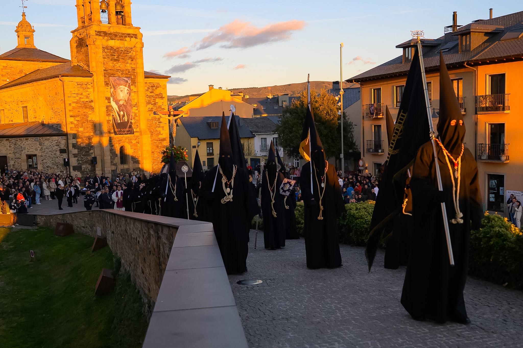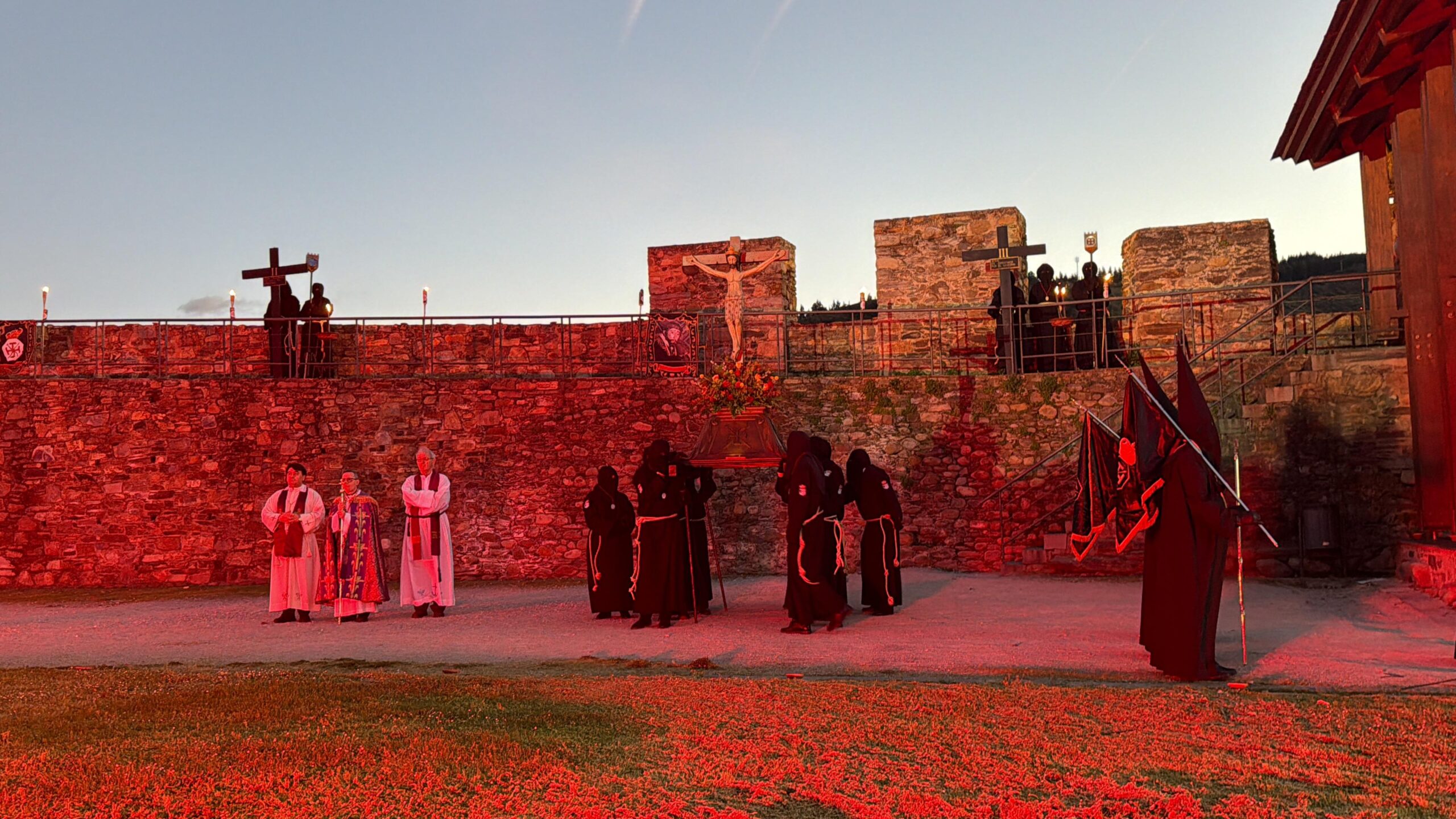 El Castillo de los Templarios volvió a ser el escenario protagonista de la Semana Santa de Ponferrada este Lunes Santo. En un ambiente de absoluto recogimiento, numerosos fieles y asistentes se congregaron en el interior de la fortaleza para participar en el tradicional viacrucis, una de las citas más simbólicas y visuales de la programación litúrgica.