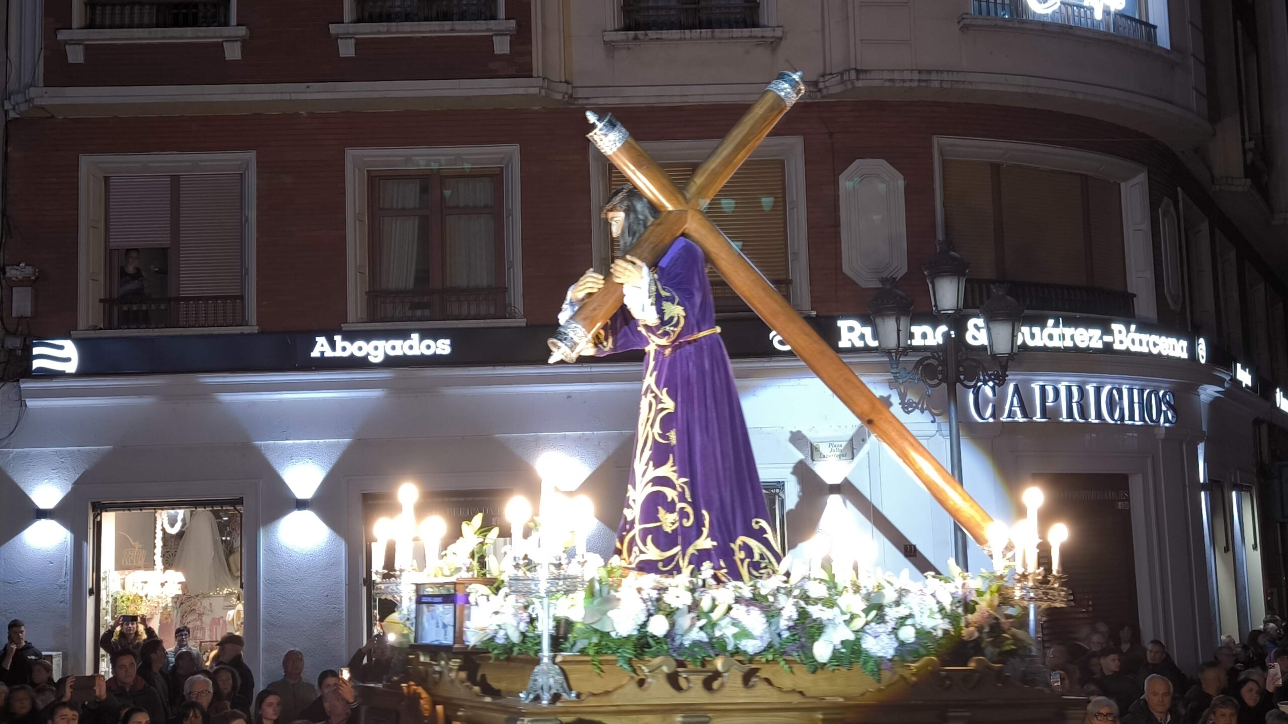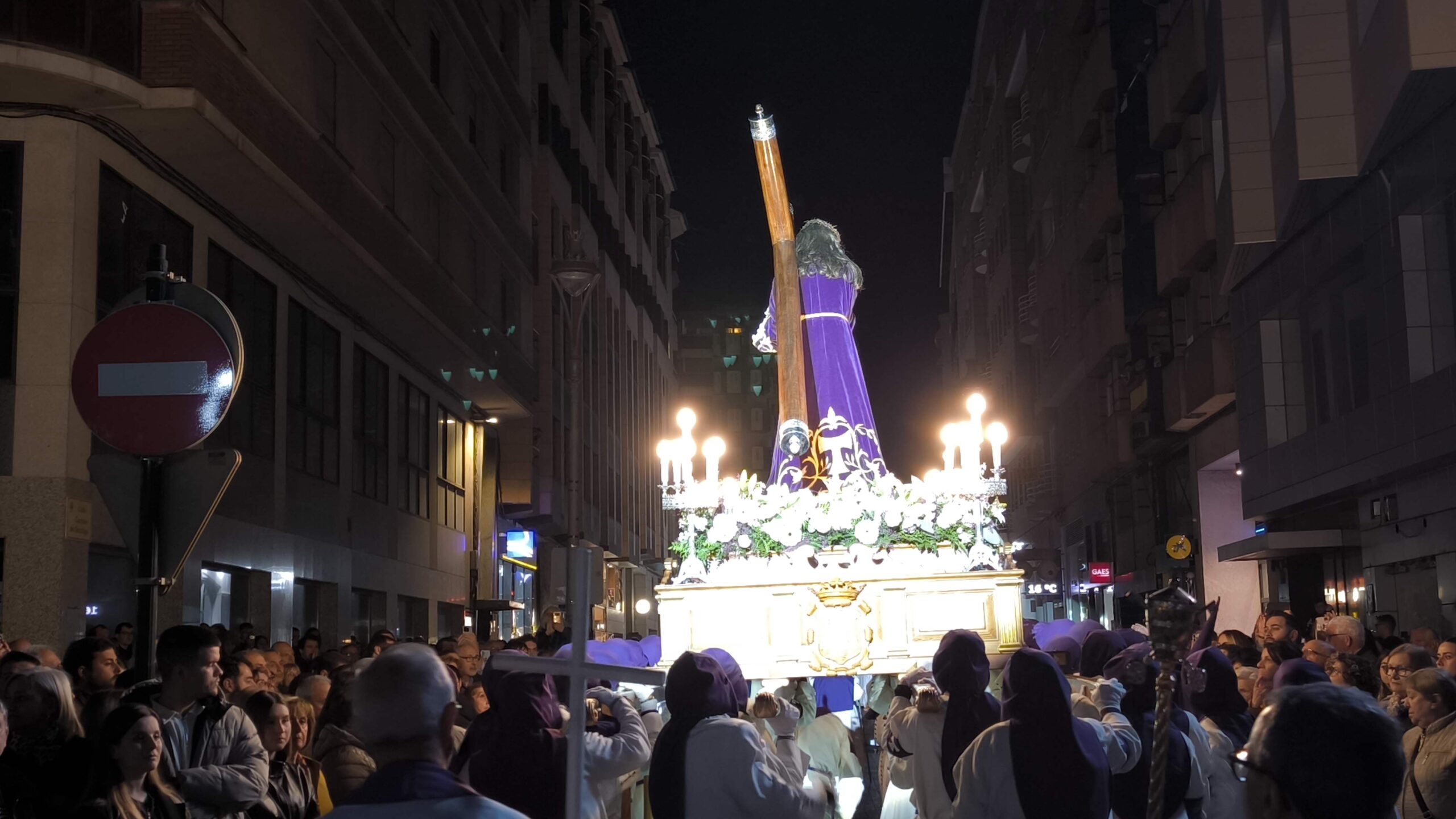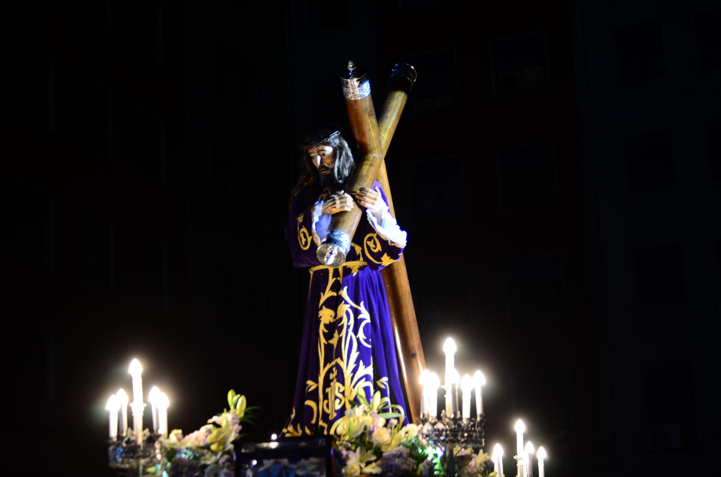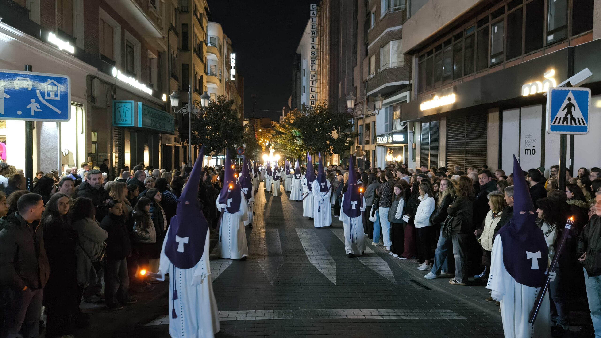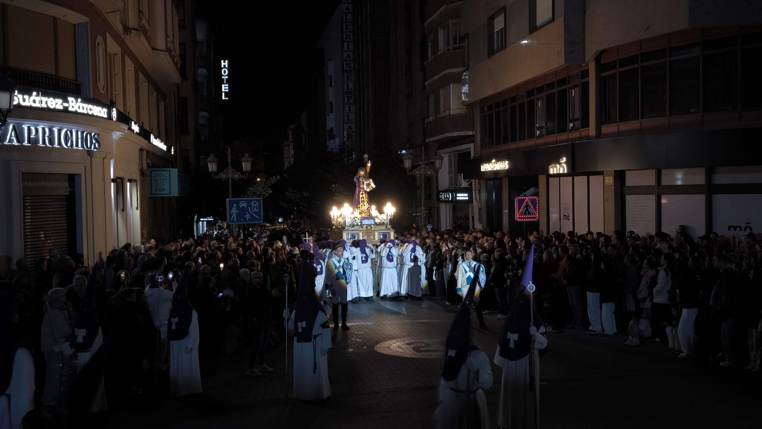 Bajo el manto de la noche y apenas iluminada por el parpadeo de los hachones, la ciudad ha enmudecido para dejar paso al sobrio desfile de los cofrades. El único sonido que rompe la calma es el rítmico golpear de las varas contra el empedrado y el murmullo de los pasos de los cargadores, que portan con devoción la imagen de Jesús el Nazareno por las vías más emblemáticas de la capital berciana.