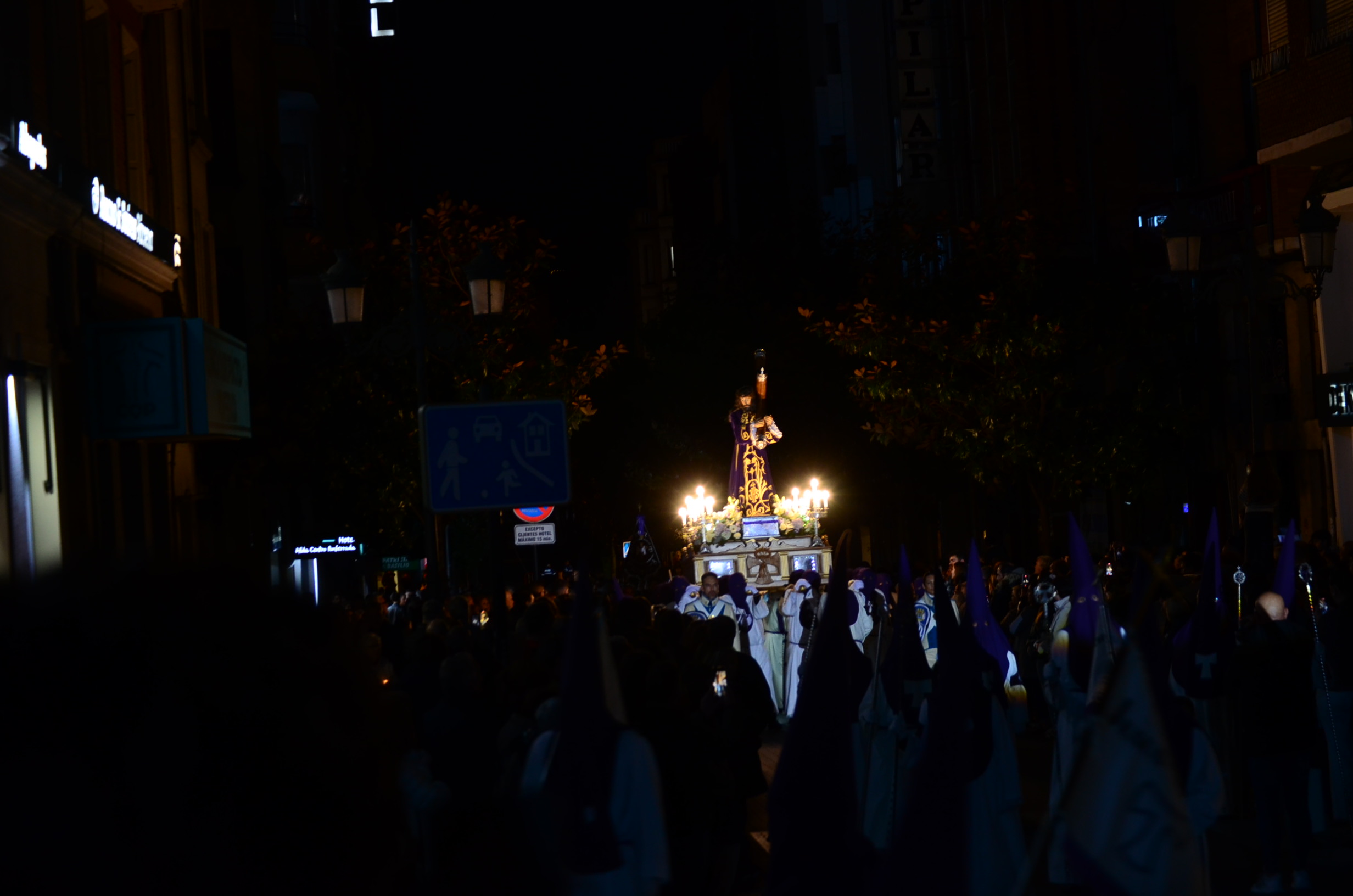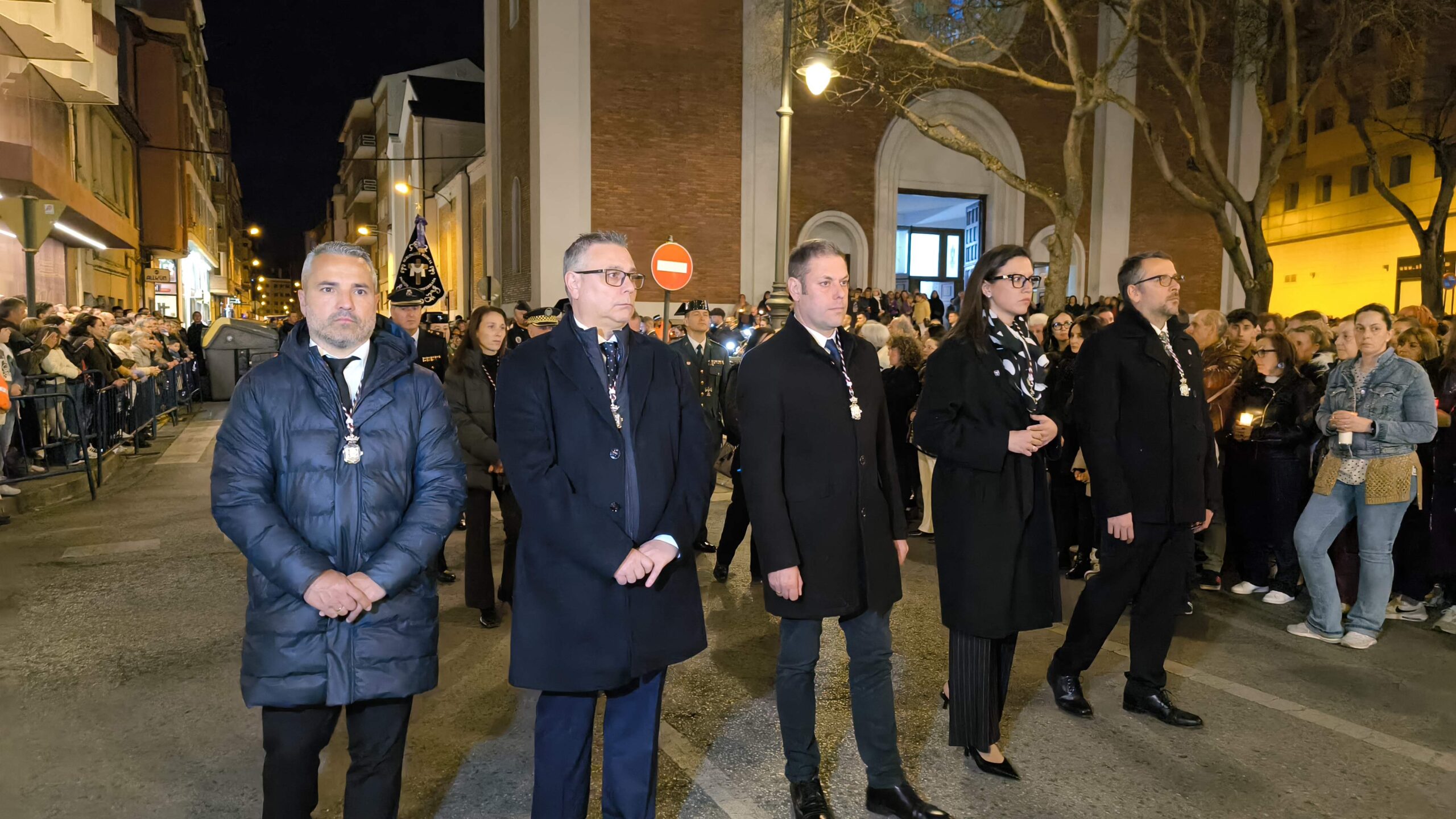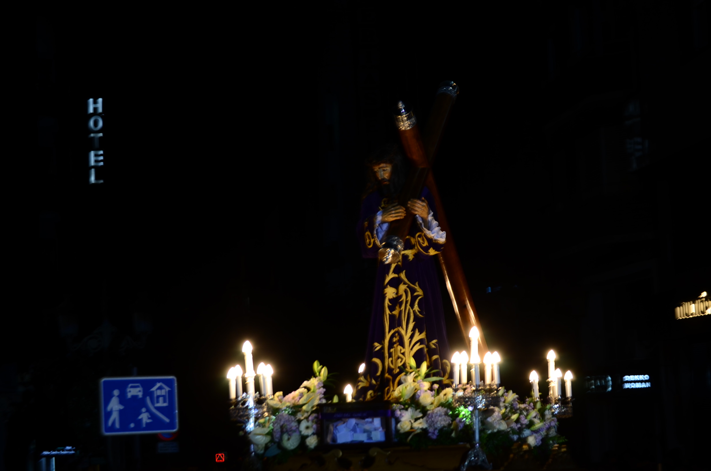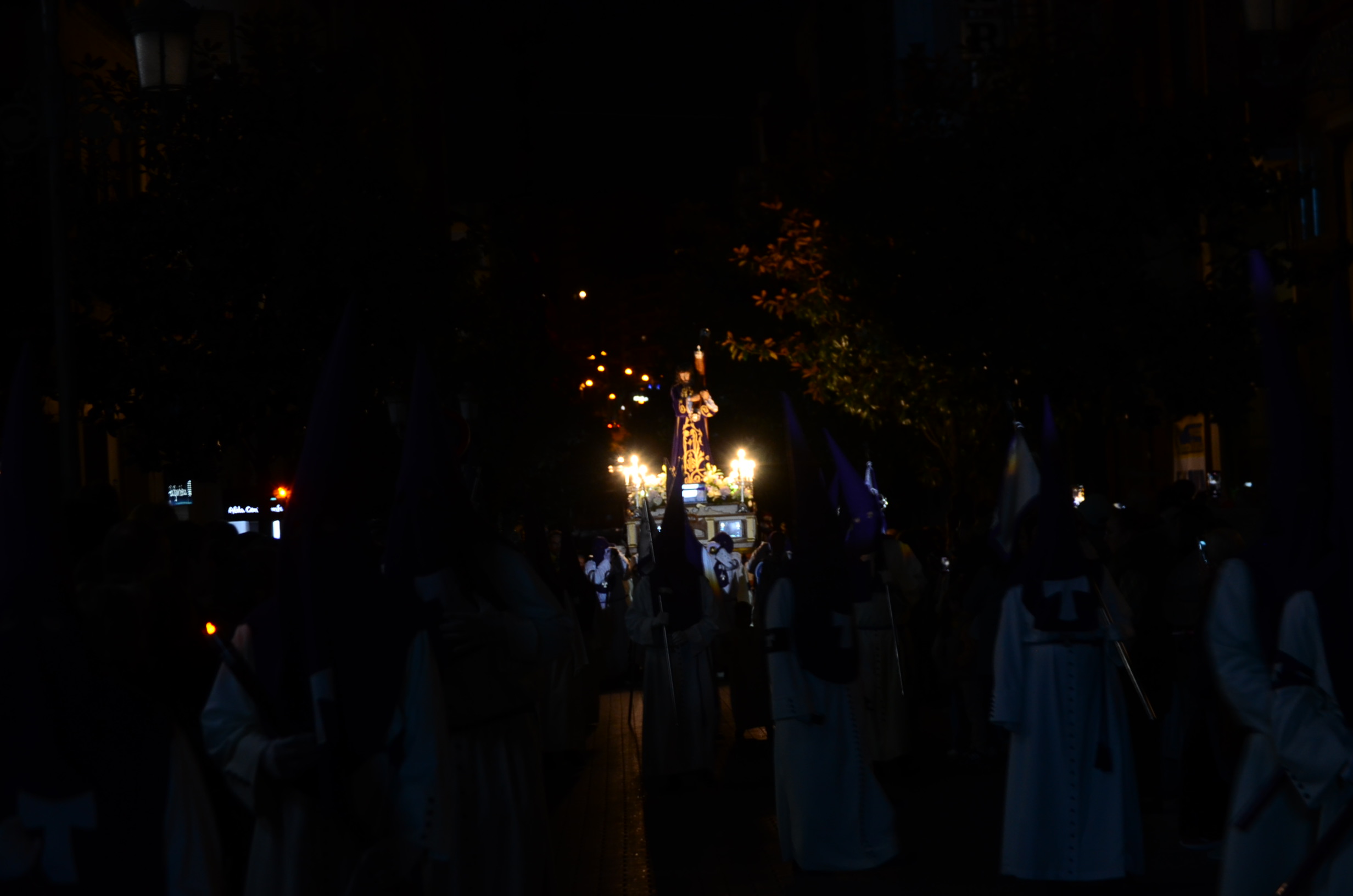Bajo el manto de la noche y apenas iluminada por el parpadeo de los hachones, la ciudad ha enmudecido para dejar paso al sobrio desfile de los cofrades. El único sonido que rompe la calma es el rítmico golpear de las varas contra el empedrado y el murmullo de los pasos de los cargadores, que portan con devoción la imagen de Jesús el Nazareno por las vías más emblemáticas de la capital berciana.