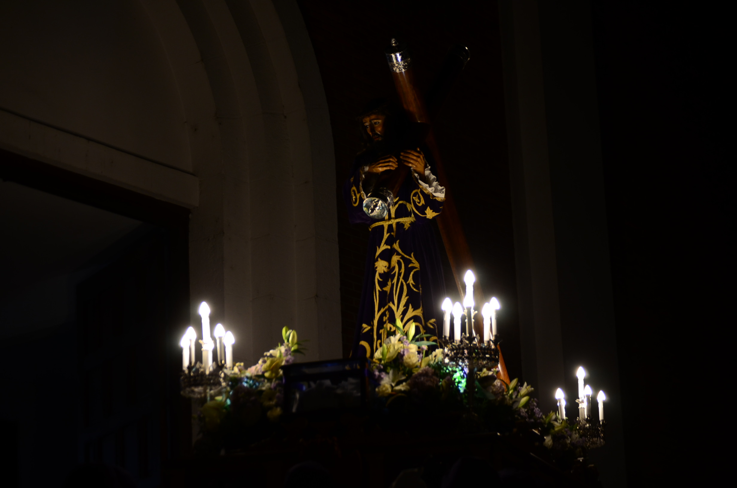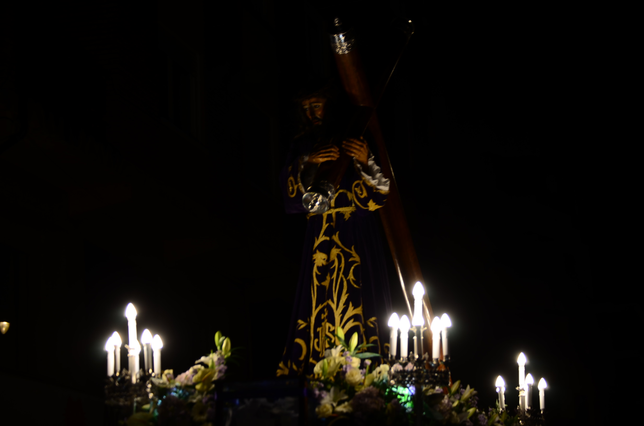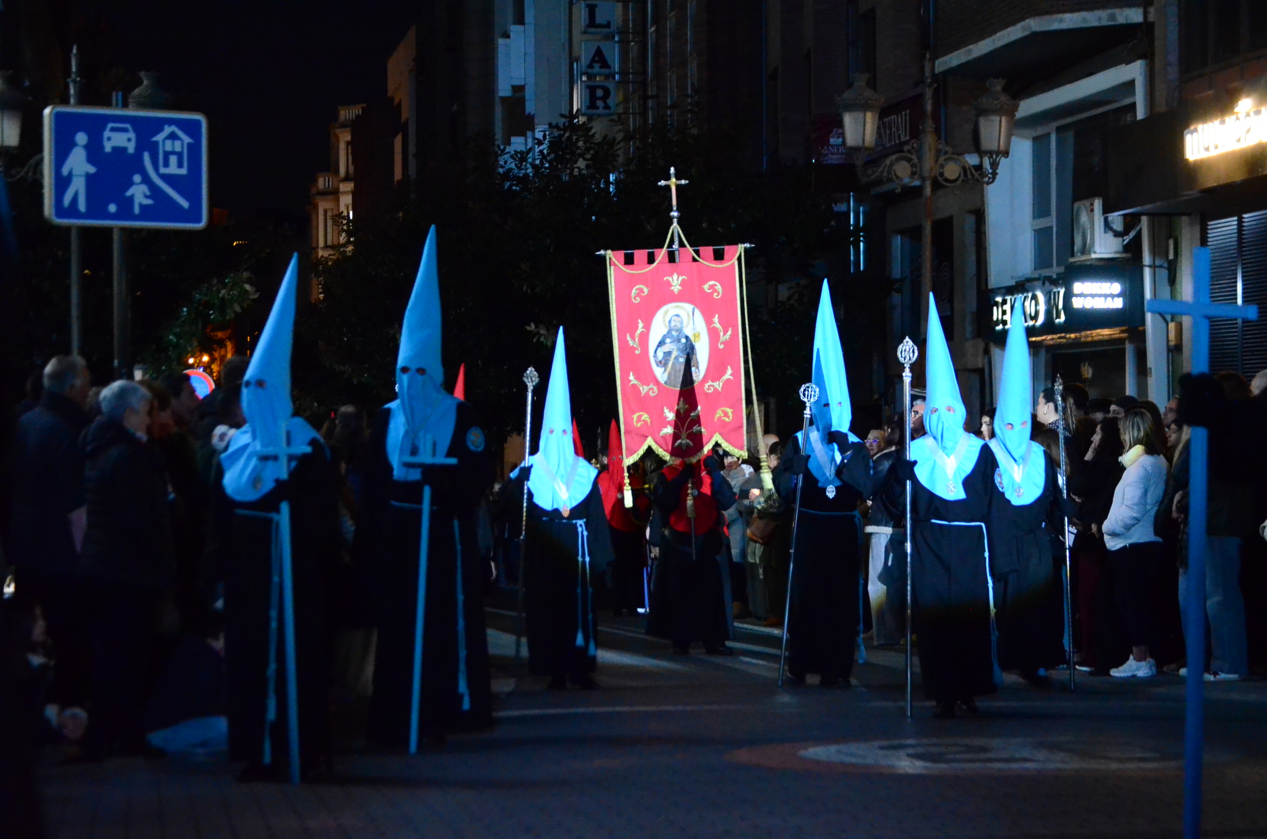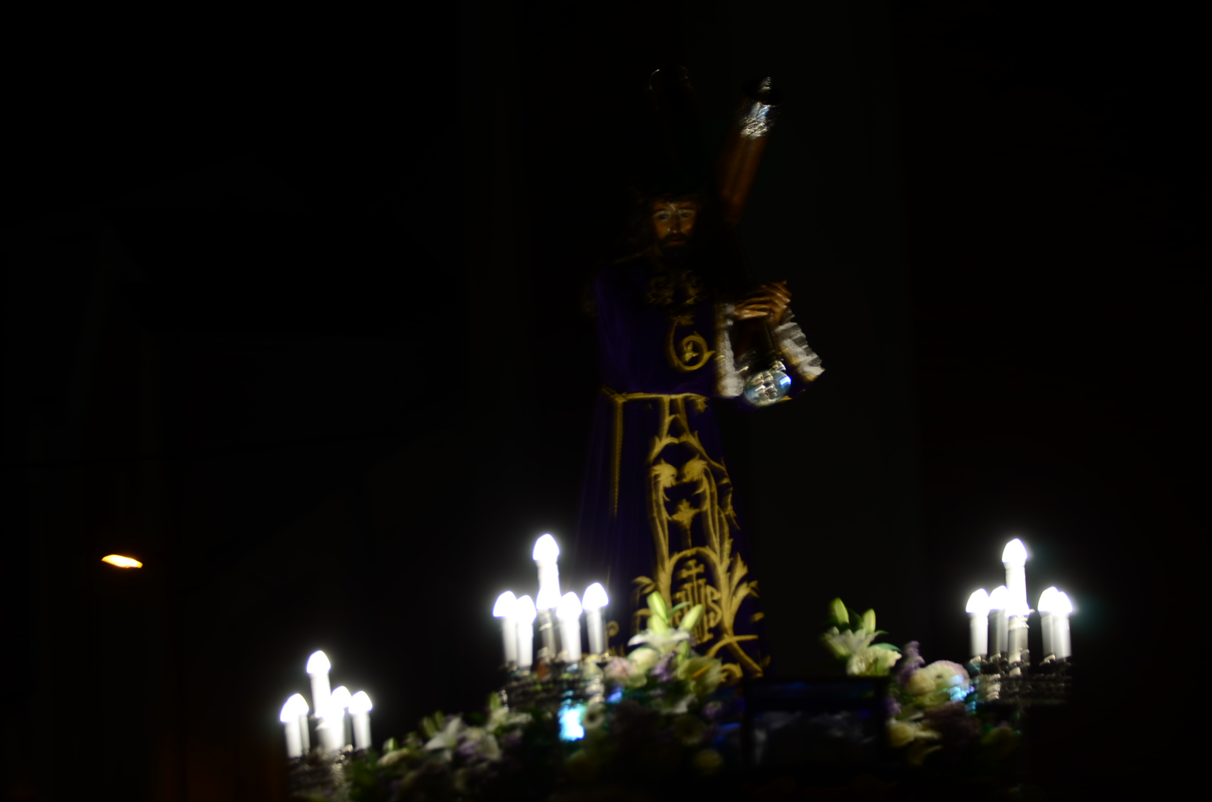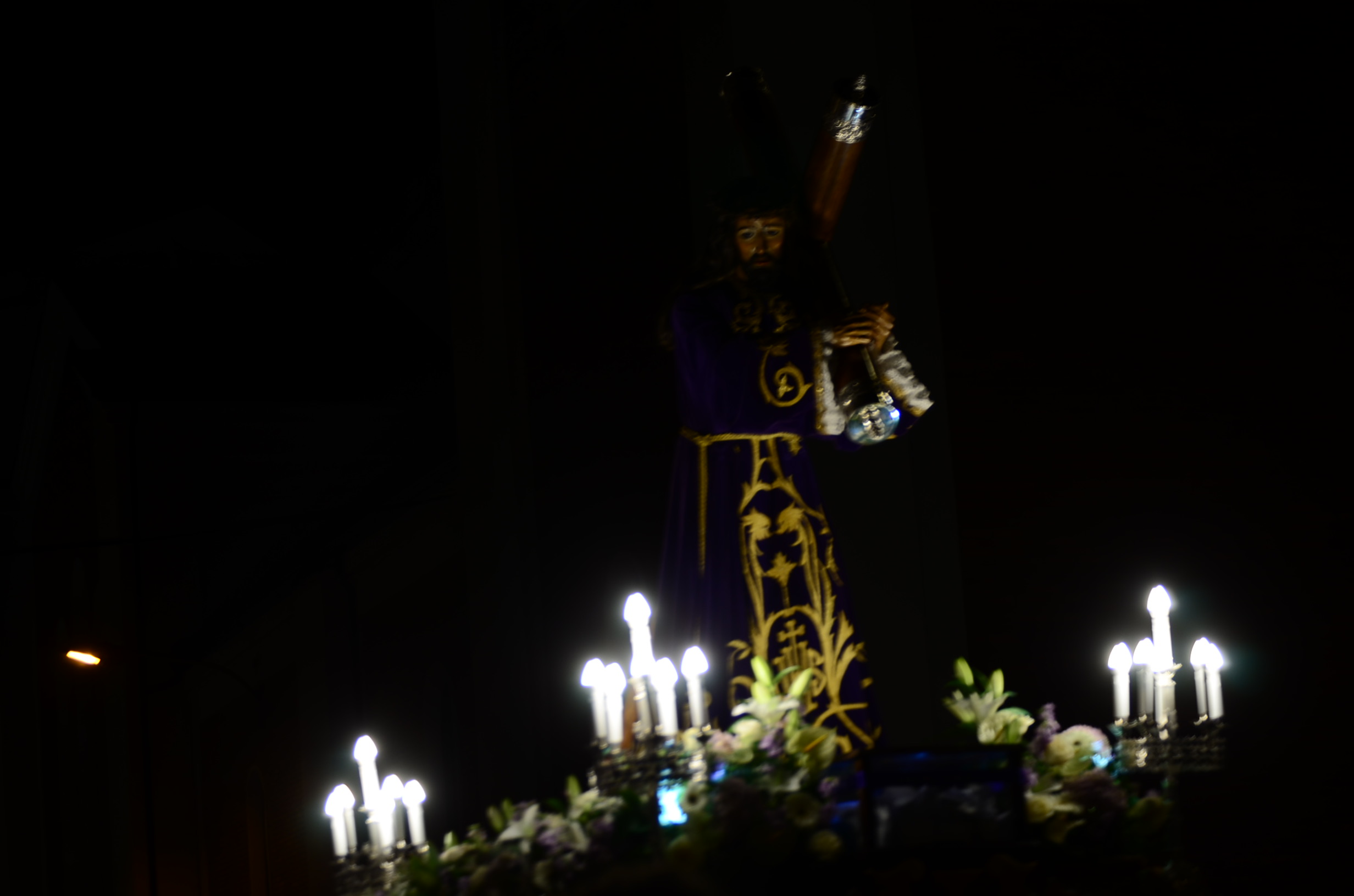 Bajo el manto de la noche y apenas iluminada por el parpadeo de los hachones, la ciudad ha enmudecido para dejar paso al sobrio desfile de los cofrades. El único sonido que rompe la calma es el rítmico golpear de las varas contra el empedrado y el murmullo de los pasos de los cargadores, que portan con devoción la imagen de Jesús el Nazareno por las vías más emblemáticas de la capital berciana.