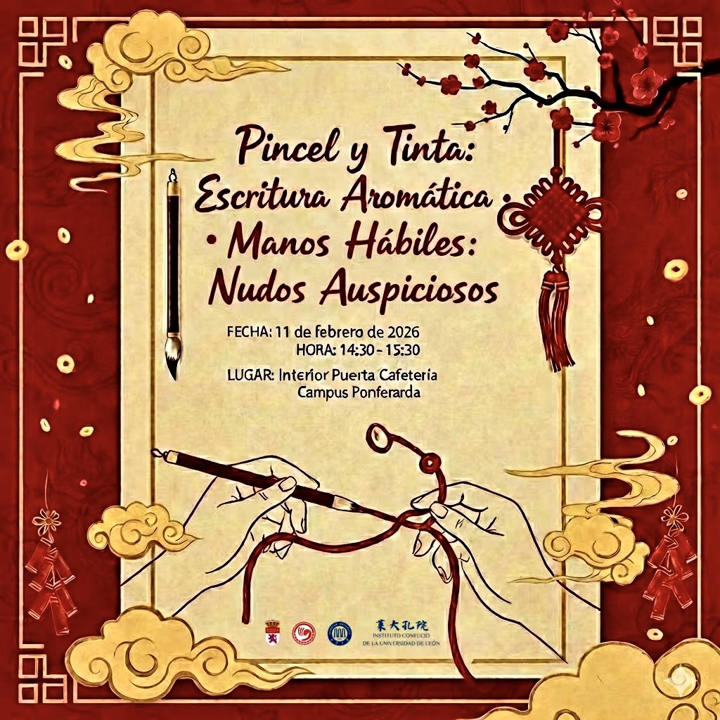 El Instituto Confucio de la Universidad de León (ULE) comienza su programa de actividades culturales en el Campus de Ponferrada con una serie de talleres prácticos diseñados para acercar las tradiciones chinas tanto a la comunidad universitaria como al público general. La primera actividad, prevista para el miércoles 11 de febrero, incluirá dos talleres simultáneos: “Pincel y Tinta: Escritura Aromática” y “Manos Hábiles: Nudos Auspiciosos”.