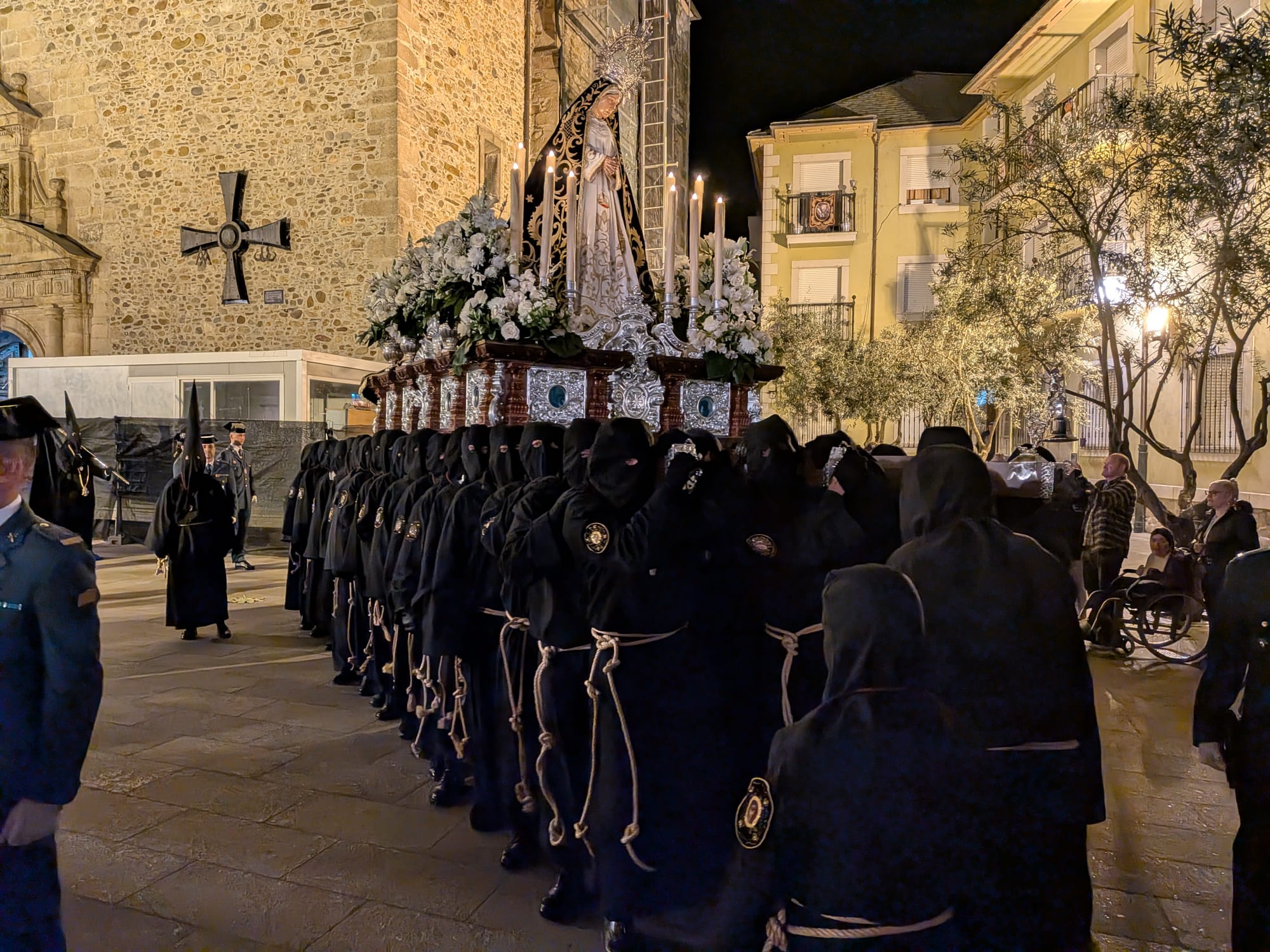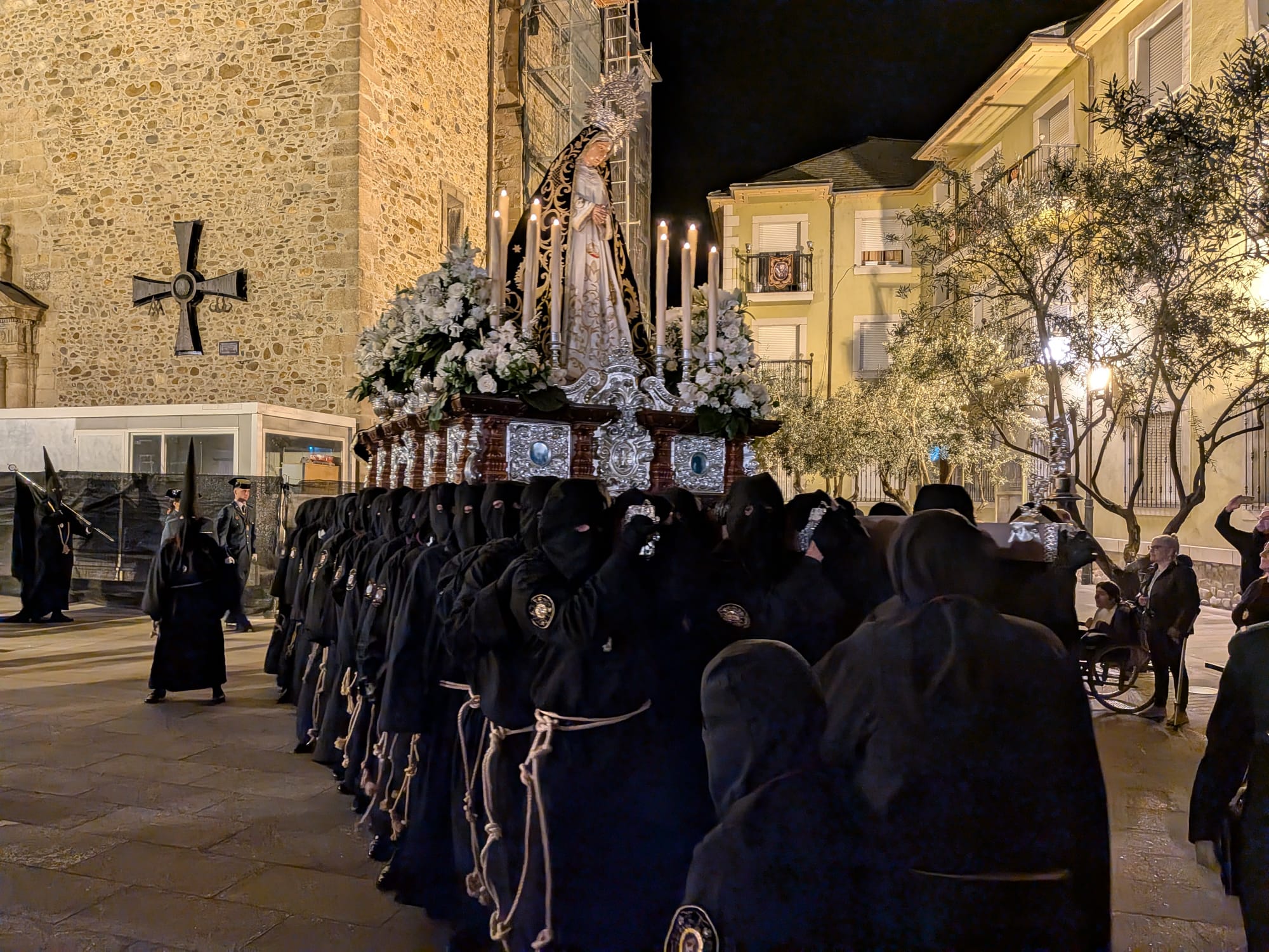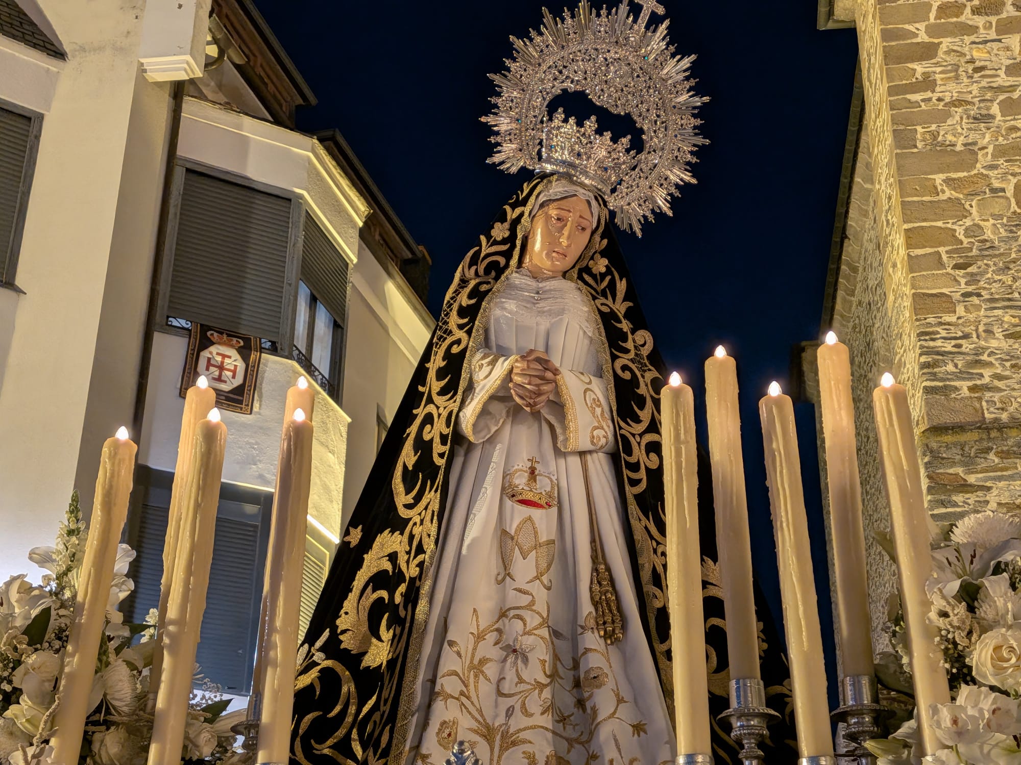 La sobriedad y el recogimiento han vuelto a ser los protagonistas de la noche de este Sábado Santo en la capital del Bierzo. Pasadas las 22:00 horas, la imagen de Nuestra Señora de la Soledad cruzaba el umbral de la Basílica de la Encina para iniciar una de las estaciones de penitencia más íntimas y esperadas por los fieles locales.
