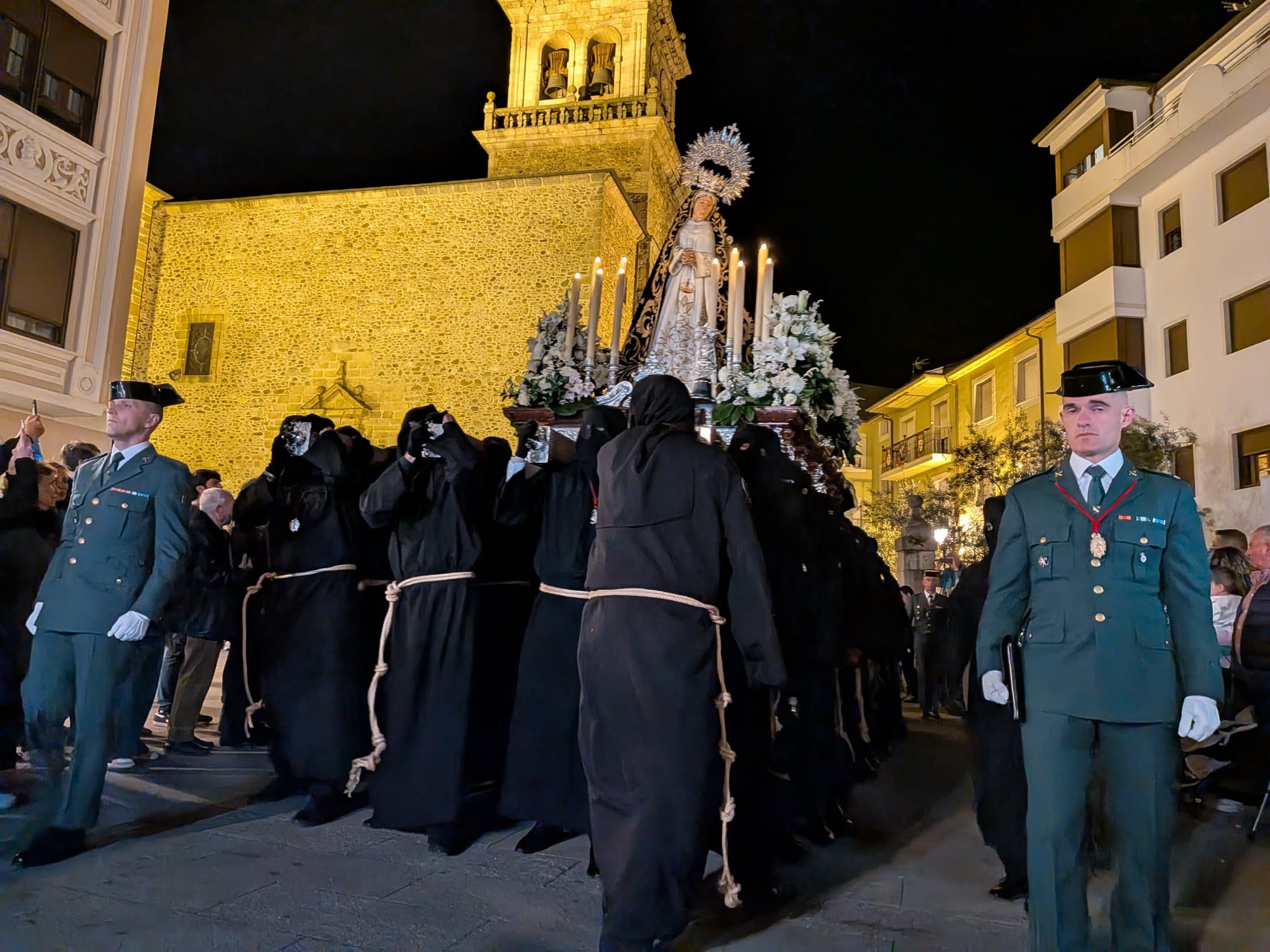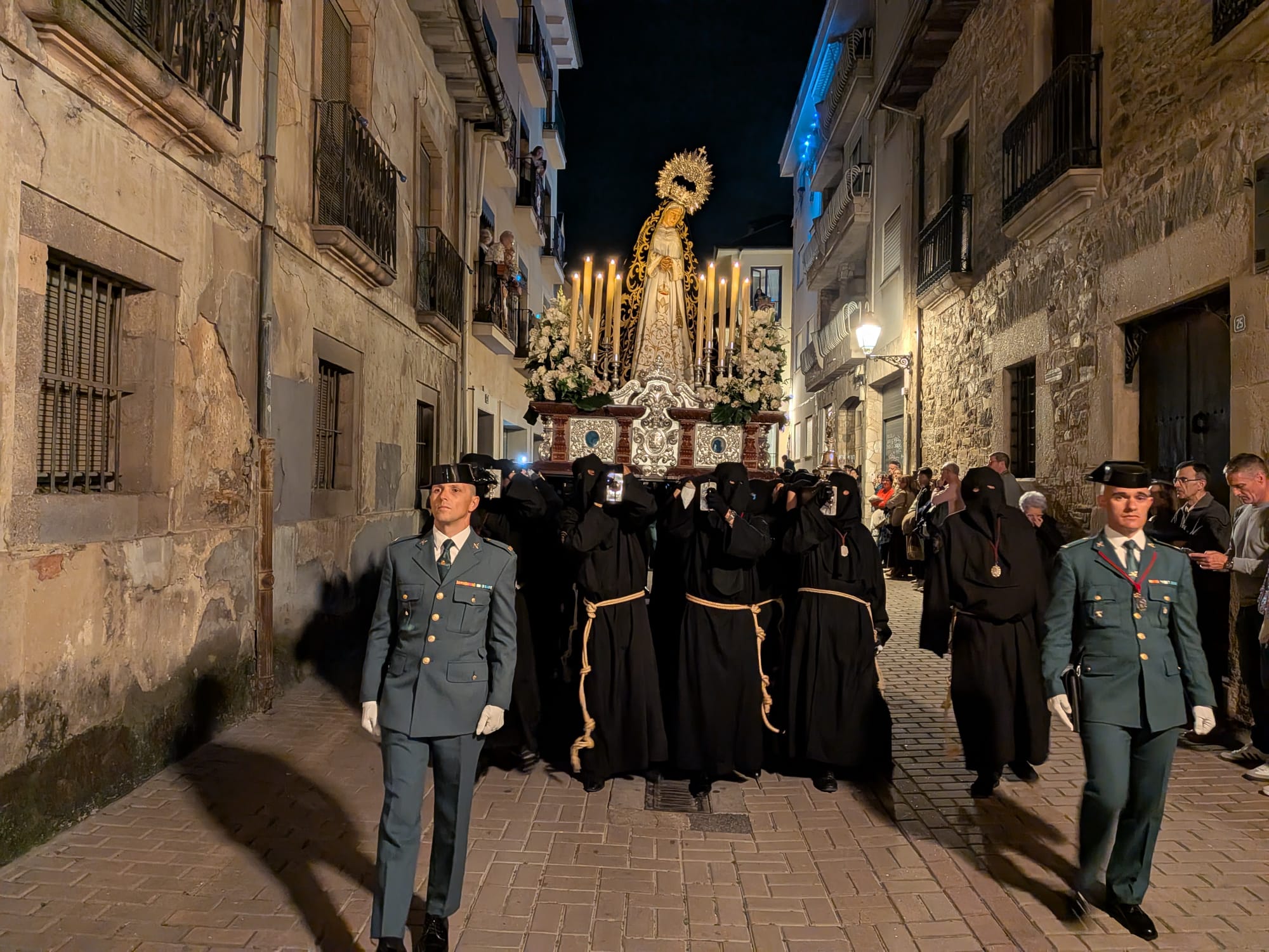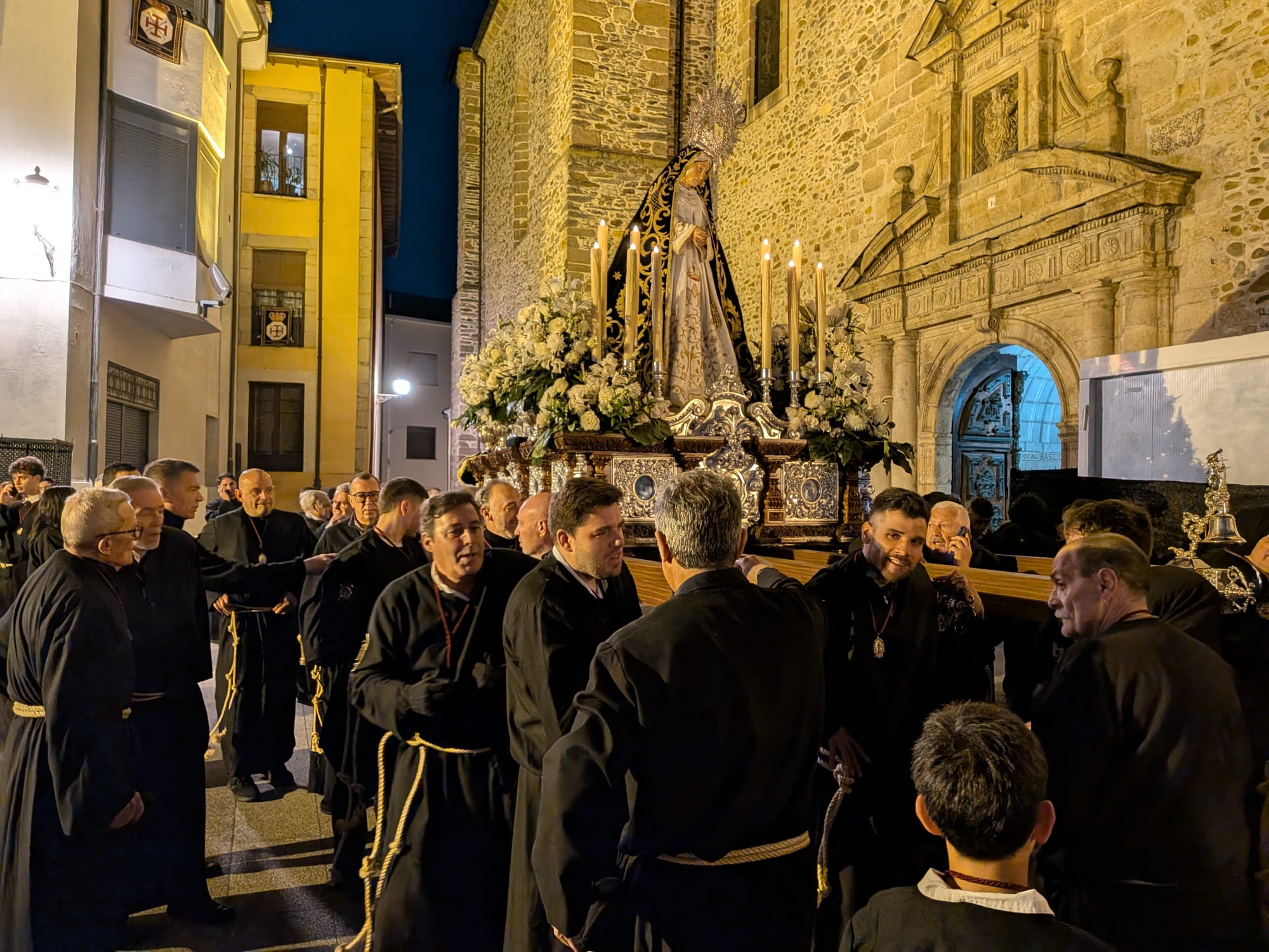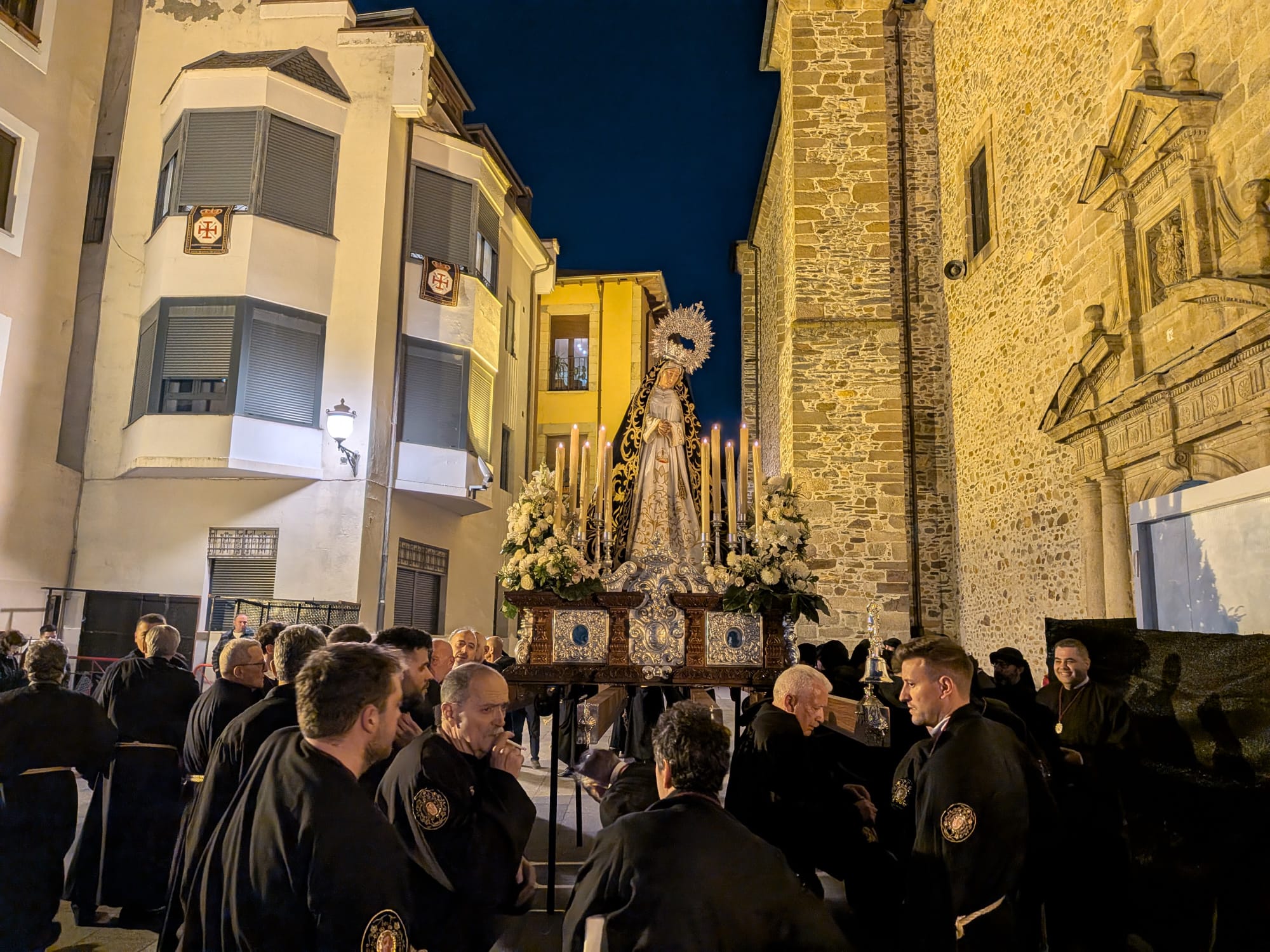 La sobriedad y el recogimiento han vuelto a ser los protagonistas de la noche de este Sábado Santo en la capital del Bierzo. Pasadas las 22:00 horas, la imagen de Nuestra Señora de la Soledad cruzaba el umbral de la Basílica de la Encina para iniciar una de las estaciones de penitencia más íntimas y esperadas por los fieles locales.