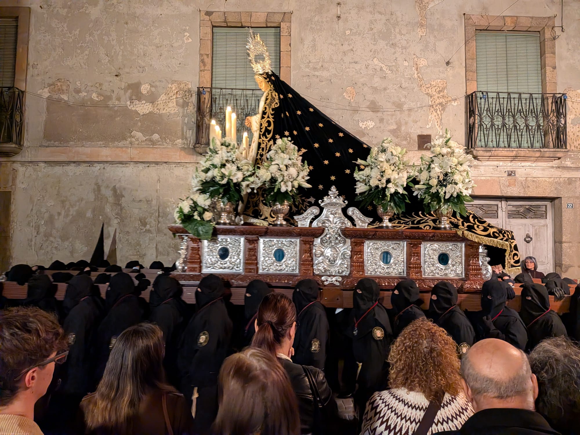 - La Plaza del Ayuntamiento, donde la hilera de capirotes negros ofrecía una estampa de tiempos pasados.