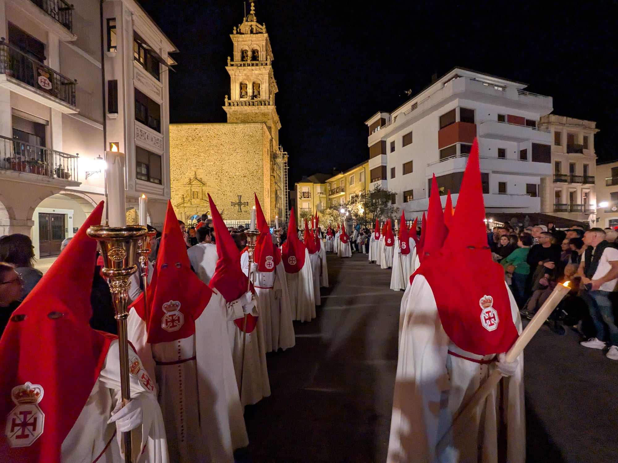 Tras cruzar la Plaza de la Encina y enfilar la calle Gil y Carrasco, la procesión se dirigió hacia la Avenida del Castillo, con la imponente fortaleza templaria como testigo mudo del avance de los cofrades.