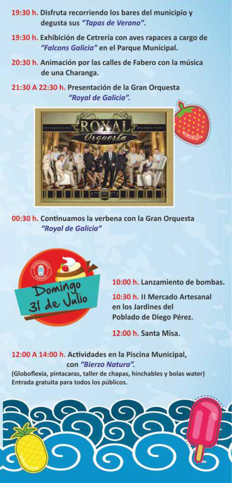El viernes el grupo ‘Raíz’ a las 00:30h pondrá el sello con su Rock. Exposición el Viaje de los Argonautas en la Casa de la Cultura. Verbenas con el Trío Florida y la Orquesta Royal Galicia