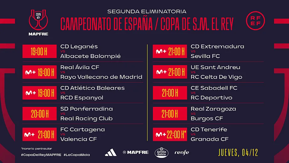La Copa del Rey MAPFRE se prepara para vivir una de sus citas más emblemáticas y democráticas. Durante los días 2, 3 y 4 de diciembre, el torneo por excelencia de nuestro fútbol celebrará su segunda eliminatoria, con un total de 28 duelos a partido único que concentrarán toda la pasión, la ilusión y los sueños de clasificación.