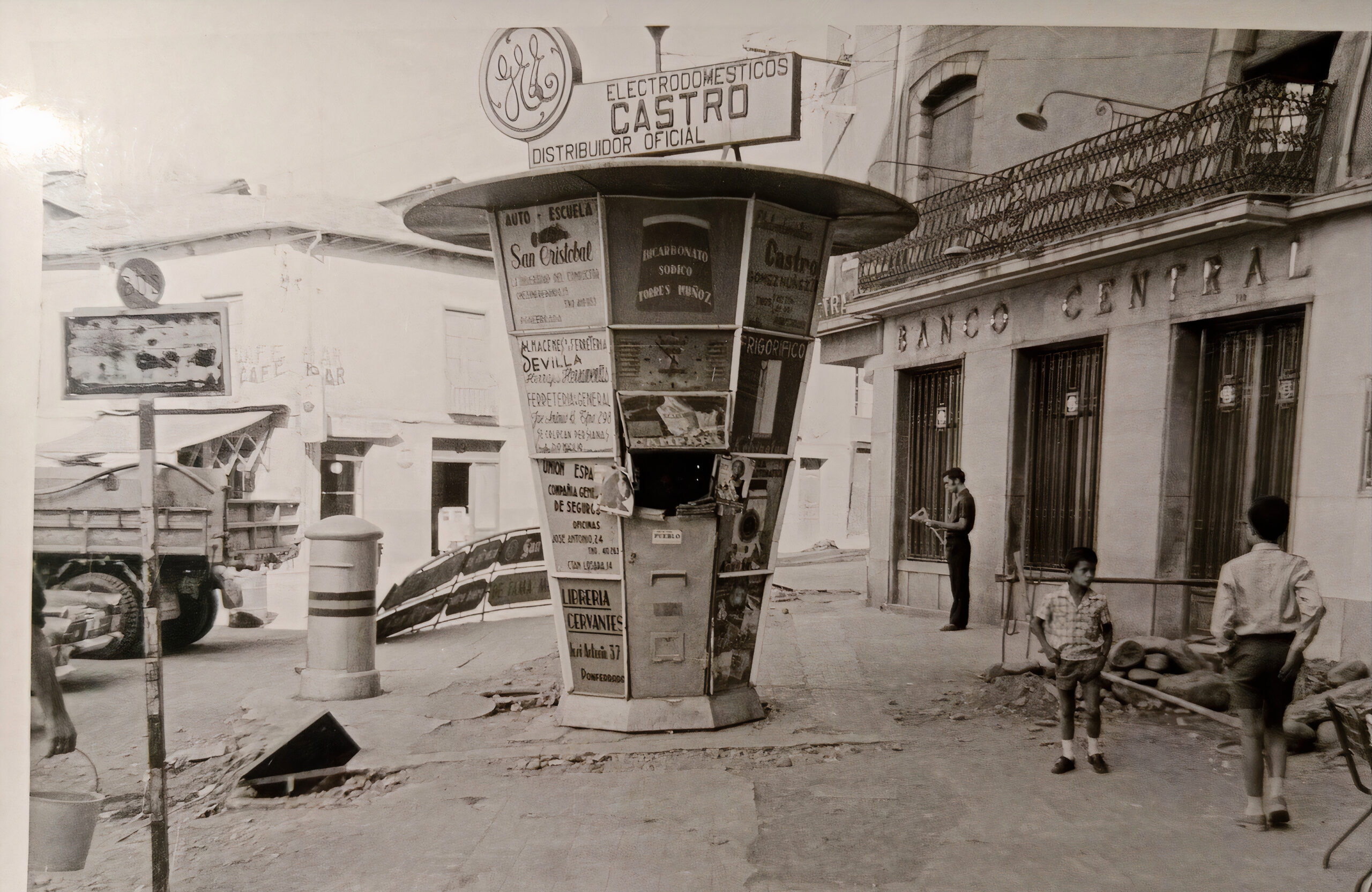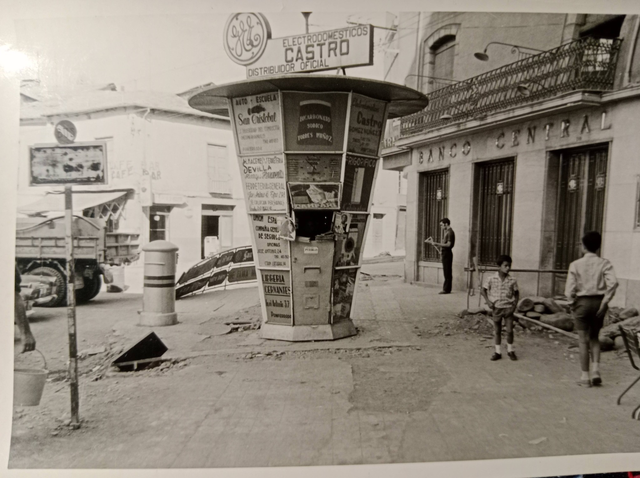 Hay una fotografía especialmente llamativa que refleja un salto unos años atrás, quizá a comienzos de los sesenta. En ella, el quiosco es diferente: tiene una forma moderna y llamativa y está cargado de publicidad. Electrodomésticos Castro, Almacenes-Ferretería Sevilla, Librería Cervantes o Campari comparten cristalera alrededor del ventanuco de la señora Julia. Bajo el hueco, una pegatina del diario Pueblo. La calle está en obras, los carteles indicativos aparecen tumbados y se adivina un camión, señal de que la plaza estaba siendo reformada.
