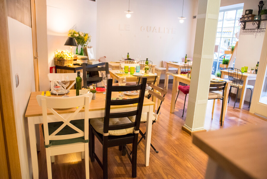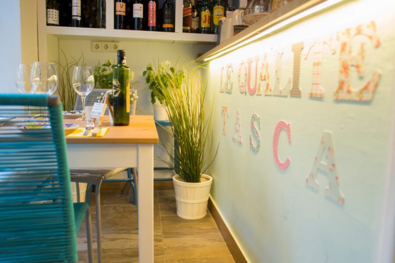 Destino: Le Qualité Tasca, un local de unas 6-7 mesas, con una ambientación moderna y acogedora, mesas en madera de estilo nórdico, sillas de múltiples modelos, suaves colores,… y esos detalles que se estilan últimamente en estos lugares que conjugan la comodidad del cliente con platos que tratan con mucho esmero la materia prima, esa estupenda cocina de mercado a la que tan buen rendimiento consiguen extraerle en este local. Digamos también que en el establecimiento tanto podemos comer o cenar como simplemente tomar algo en barra y continuar ruta de chateo.