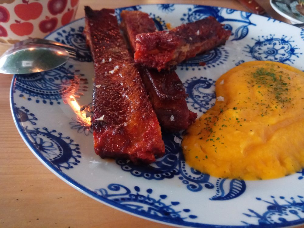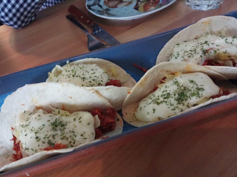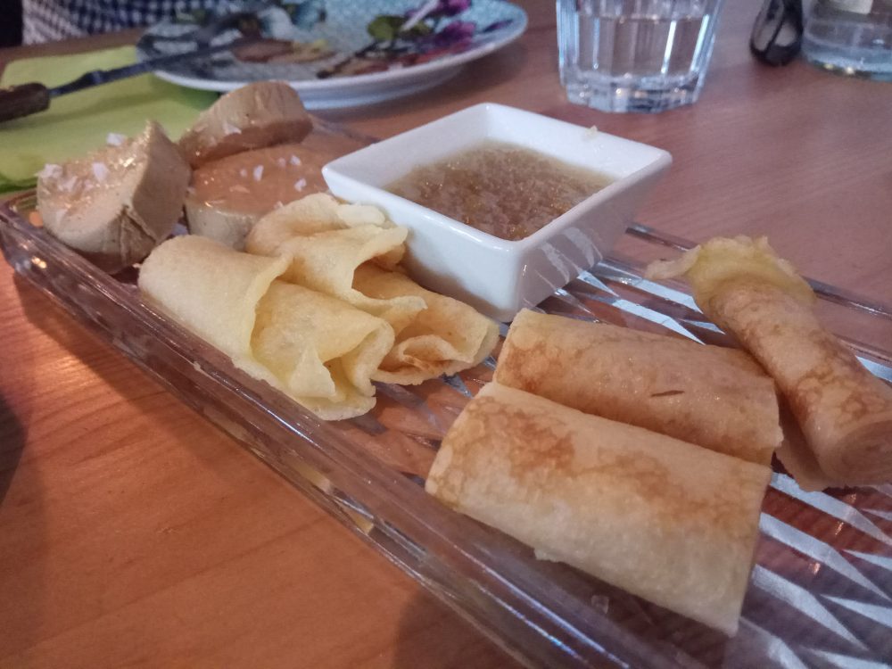Degustamos cuatro platos a compartir entre tres personas, de los cuales me gustaría destacar, sin desmerecer todo lo probado, dos de ellos: los fixuelos con mi-cuit de foie (elaborado por la casa) y plátano caramelizado, sorprendente y maravillosa combinación, simplemente ineludibles si pasáis por allí; y unos tacos de botillo del Bierzo con repollo y cremoso de cachelo: perfecto conjunto que presenta, muy acertadamente me permito afirmar, los sabores del rey de la gastronomía local a paladares no acostumbrados. No oséis perdéoslos, en serio.