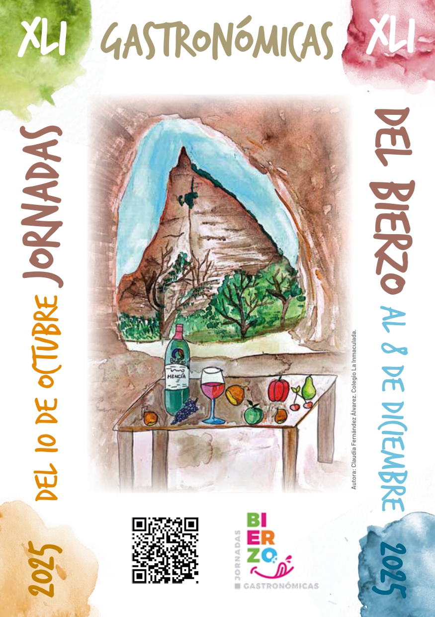 - El cartel oficial representa productos del Bierzo con el paisaje de Las Médulas al fondo, obra de Claudia Fernández Álvarez. Ponferrada Hoy