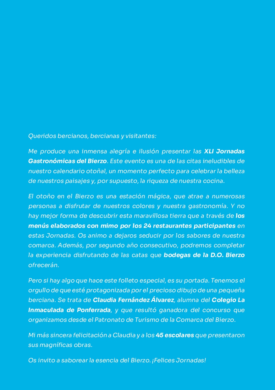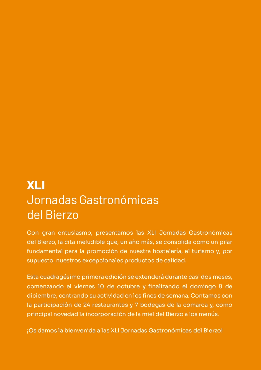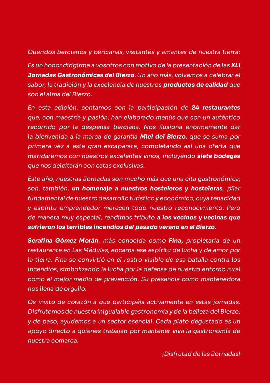 Las XLI Jornadas Gastronómicas del Bierzo 2025 se celebrarán del 10 de octubre al 8 de diciembre, activándose solo durante los fines de semana. Este año participan 24 restaurantes de la comarca, que pondrán en valor los productos del Bierzo con propuestas culinarias singulares. Ponferrada Hoy