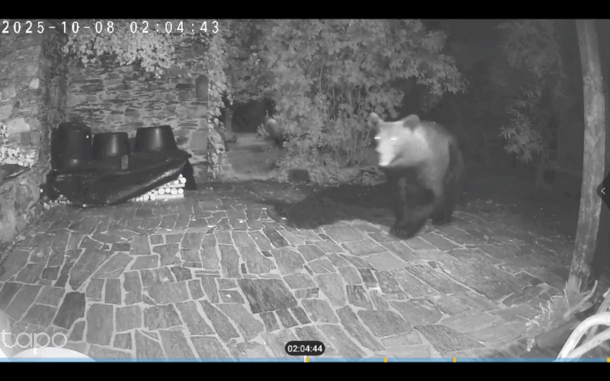 Cada vez con mayor frecuencia, un curioso visitante se acerca con total tranquilidad a una vivienda del casco urbano de una localidad del Alto Sil, ya en el Bierzo. Los propietarios prefieren no desvelar la ubicación, pero las imágenes hablan por sí solas: un oso pardo que ha hecho del jardín su pequeño refugio nocturno.