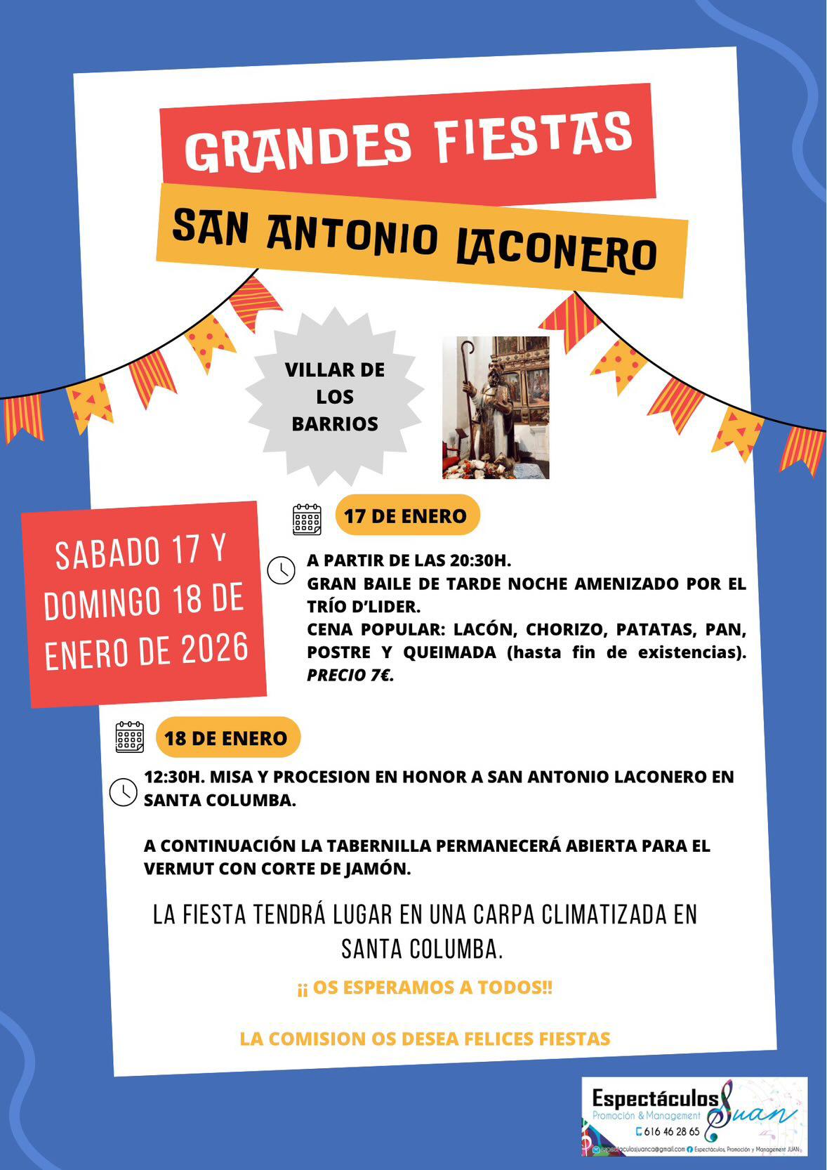 La localidad berciana de Villar de los Barrios celebrará los próximos 17 y 18 de enero sus Grandes Fiestas en honor a San Antonio Laconero, con una programación centrada en la gastronomía tradicional, la música y los actos religiosos. Los actos se desarrollarán en una carpa climatizada instalada en Santa Colomba, donde se espera reunir a vecinos y visitantes.