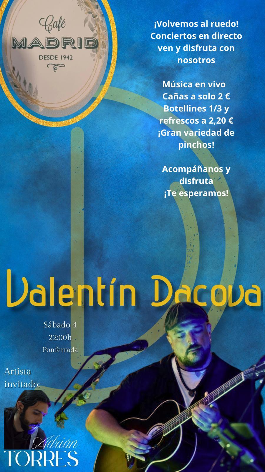 El mítico Café Madrid, situado en el centro de Ponferrada y con historia desde 1942, vuelve a llenarse de música en directo este sábado 4 de octubre. La sala, que apuesta por el talento y la cultura local, arranca su nueva temporada de conciertos con la actuación de Valentín Dacova, un artista que hará vibrar al público con su directo íntimo y cercano.